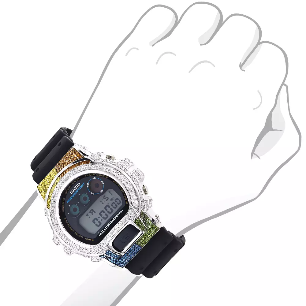 Casio 6900 G-SHOCK White Blue Green Brown Yellow Diamonds Bezel Watch 5ct