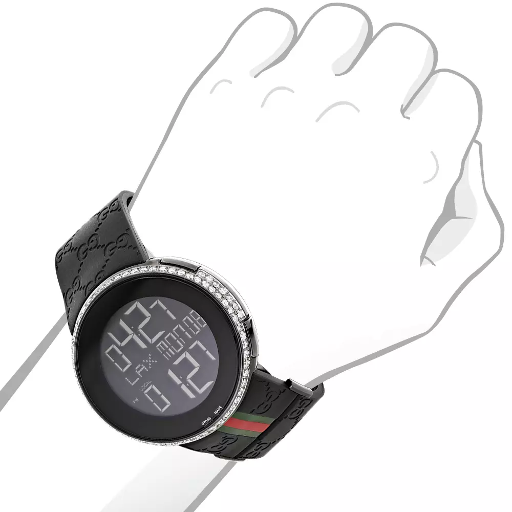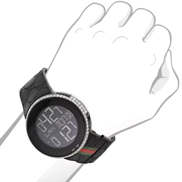 Genuine Gucci men’s luxury watch features 2.5 carats of sparkling white diamonds around the black stainless steel case, a scratch resistant sapphire crystal, a black rubber strap with green/red/green web and a digital dial code. This men’s Gucci diamond watch showcases a fine Swiss-made movement and is water-resistant to 30 m (100 ft).