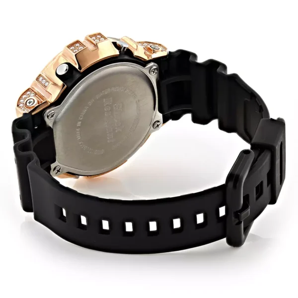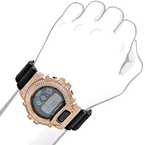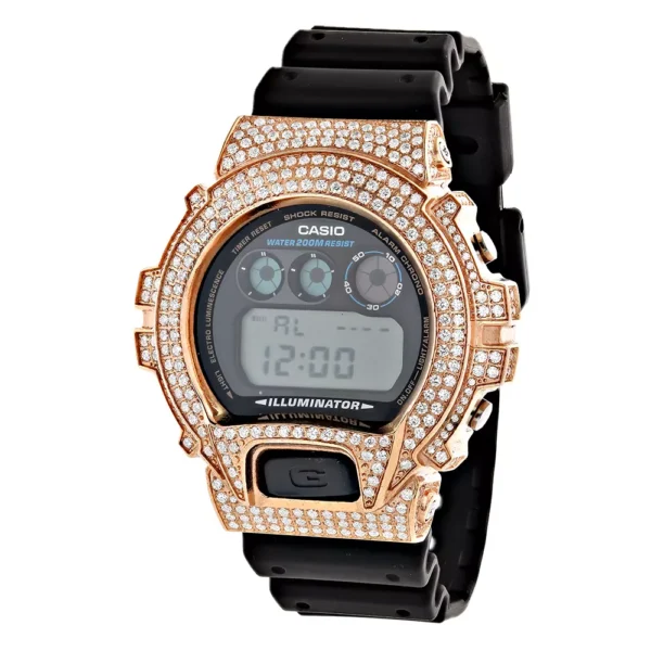 Rose gGold Plated Cassio Watches: This Custom Iced Out Casio G-Shock White CZ Crystal Watch is based on the original DW6900 Casio G-Shock model. This crystal-encrusted men’s watch features sparkling white crystals around the bezel, a bronze tone stainless steel case, a black rubber band and a digital dial code. This Casio G-Shock watch is water-resistant to 200m. This G-Shock Crystal Watch is a stylish addition to any wrist watch collection.
