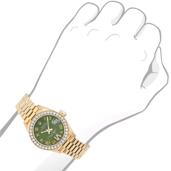 Women’s 18K Gold Watch Rolex Datejust 26mm Green Dial Diamond Bezel. This diamond Rolex watch is pre-owned, in excellent condition, and comes in a Rolex box with a full warranty from ItsHot.com. Customize the look of the watch if you prefer with diamond bezel or fluted bezel. Each watch can be additionally customized with diamonds on the case as well as band (please contact us for details).