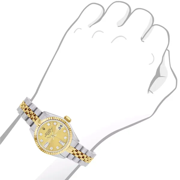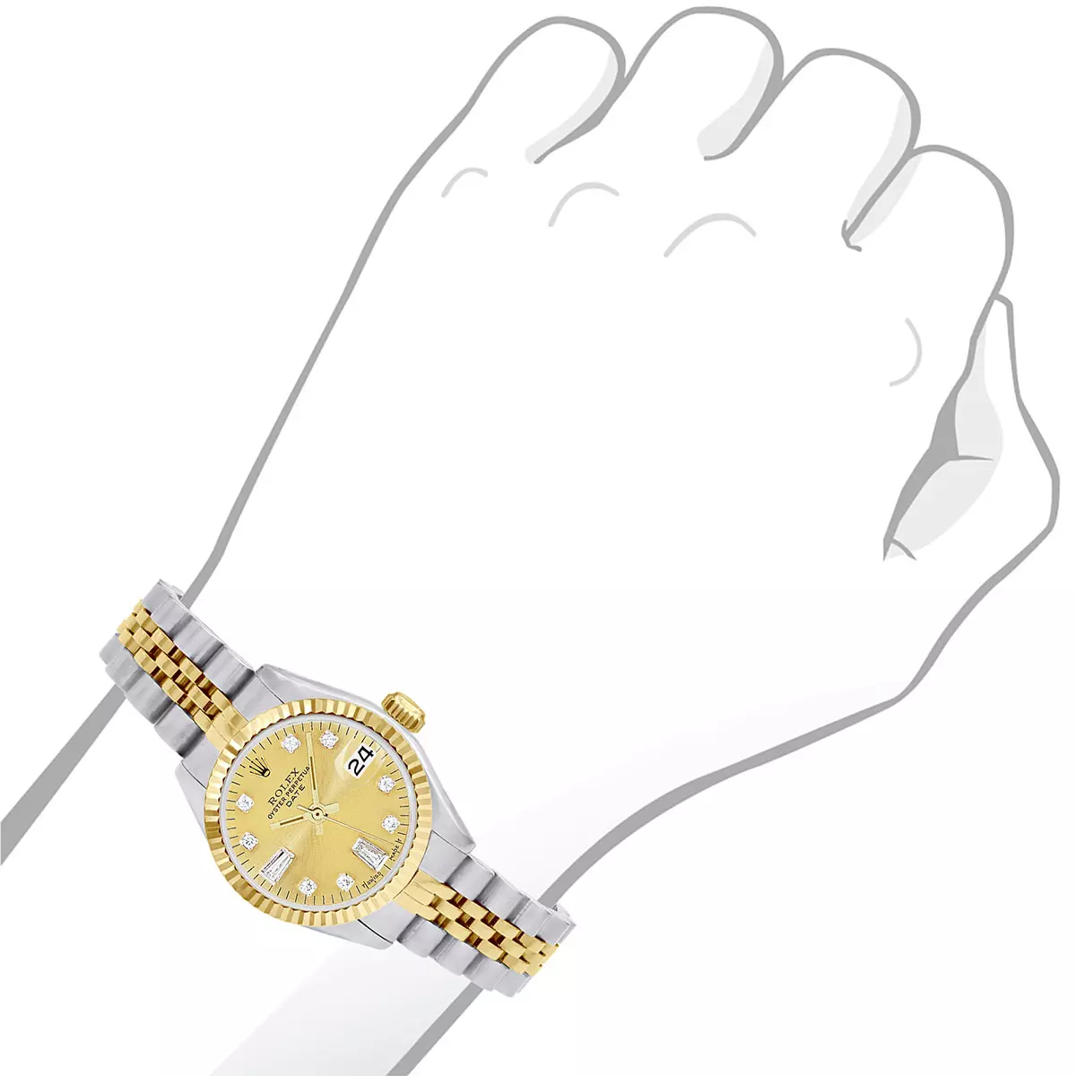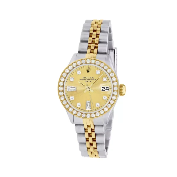 Women’s Gold Watch Rolex Datejust 26mm Jubilee Bracelet Gold Tone Dial. This diamond Rolex watch is pre-owned, in excellent condition, and comes in a Rolex box with a full warranty from ItsHot.com. Customize the look of the watch if you prefer with diamond bezel or fluted bezel. Each watch can be additionally customized with diamonds on the case as well as band (please contact us for details).